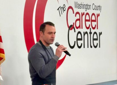 - Washington County Career Center Superintendent Tony Huffman thanks the food service staff and student helpers for making the luncheon possible on Wednesday. (Photo by Amber Phipps)