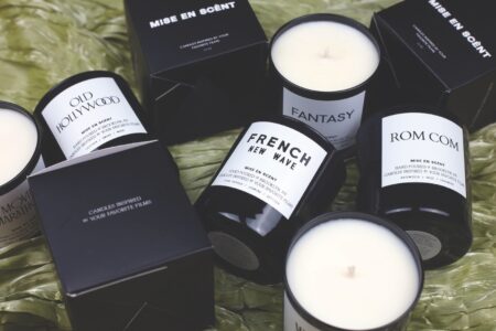 This image released by Mise En Scent shows a variety of their film-inspired scented candles. (Mise En Scent via AP)