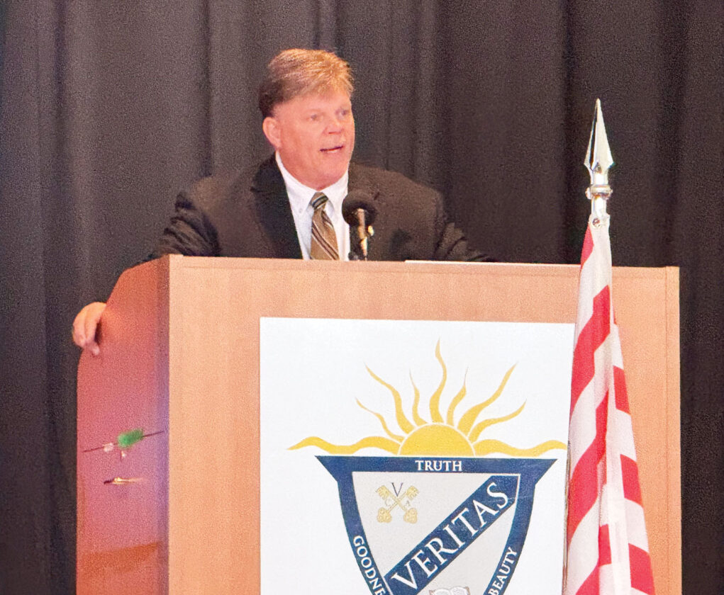 - Ohio Rep. Kevin Ritter speaks briefly on the history of the U.S. Marine Corps and everything they’ve done for the country at the 250th anniversary of the Marines celebrated at Veritas Classical Academy on Monday. (Photo by Amber Phipps)