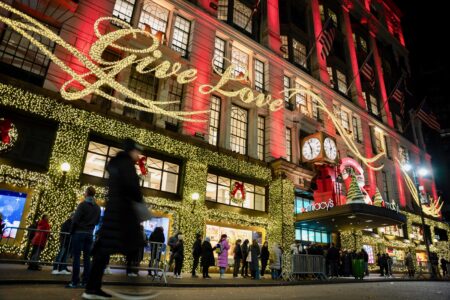 - FILE – Shoppers wait in line to enter Macy’s flagship store on Nov. 28, 2025 in New York. (AP Photo/Angelina Katsanis, File)