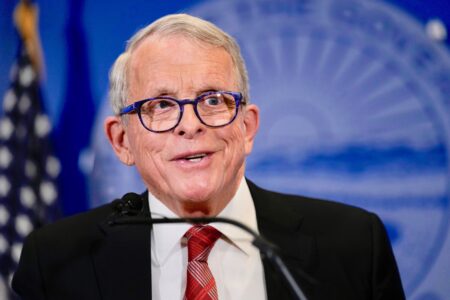 - FILE – Ohio Gov. Mike DeWine speaks during a news conference, Dec. 29, 2023, in Columbus, Ohio. (AP Photo/Carolyn Kaster, File)