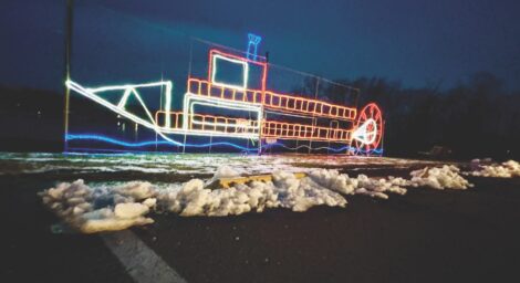 A sternwheeler rendered in Christmas lights illuminates a portion of Civitan park in Belpre. It’s among the Holiday Lights displays in the park, where the new Belpre Christmas Market is held Fridays and Saturdays and where some of the many activities for Saturday’s Christmas Crawl are planned. (Photo by Art Smith)