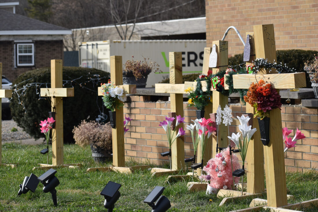 Wooden crosses outside the Triadelphia United Methodist Church – each representing a victim of the deadly June 14 flood that ravaged the community – remain in place six months later, with some decorated for the holiday. (Photo by Eric Ayres)