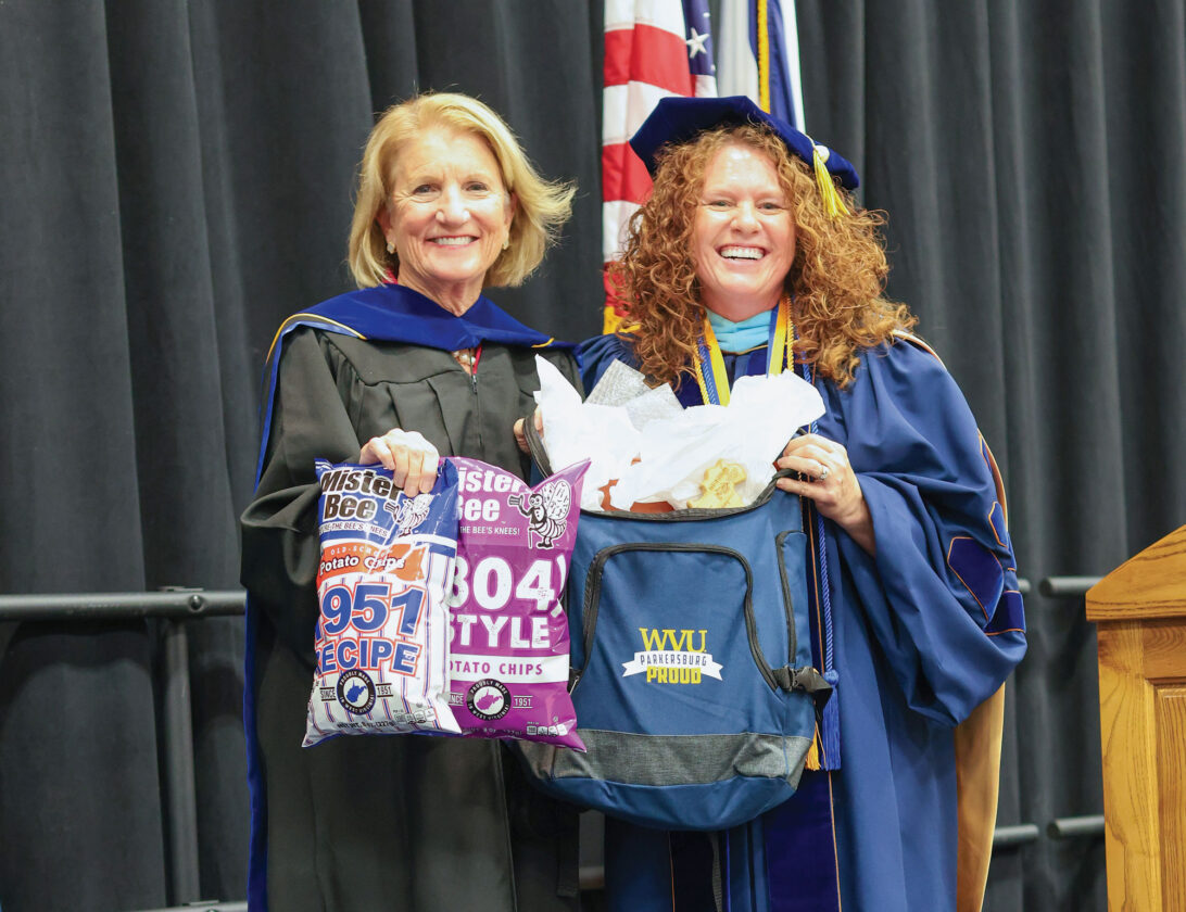 - Photo Provided From left, Sen. Shelley Moore Capito of West Virginia receives a basket filled with goods from West Virginia manufacturers, including Mister Bee potato chips, from WVU Parkersburg President Torie Jackson. The college’s Fall 2025 Commencement was held on Saturday.
