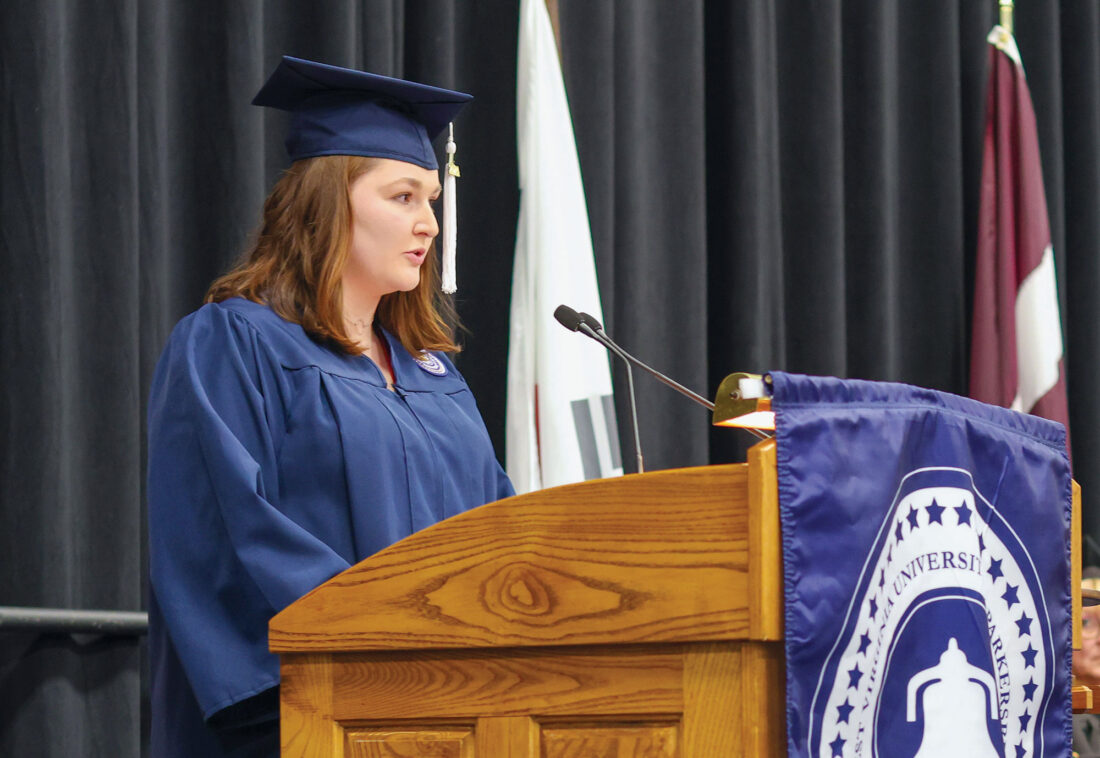 - Photo Provided Trista Scarberry, president of the WVU Parkersburg Student Government Association, welcomes graduates and guests on Saturday at the Fall 2025 Commencement.