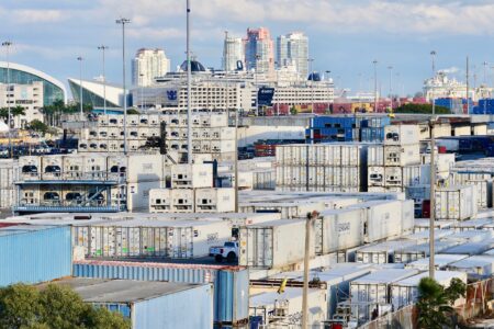 - Containers are stacked Thursday, Jan. 15, 2026, at PortMiami in Miami. (AP Photo/Lynne Sladky)