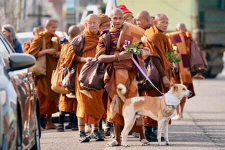 - Buddhist monks who are participating in the, “Walk For Peace,” are seen with their dog, Aloka, Thursday, Jan. 8, 2026, in Saluda, S.C. (AP Photo/Allison Joyce)