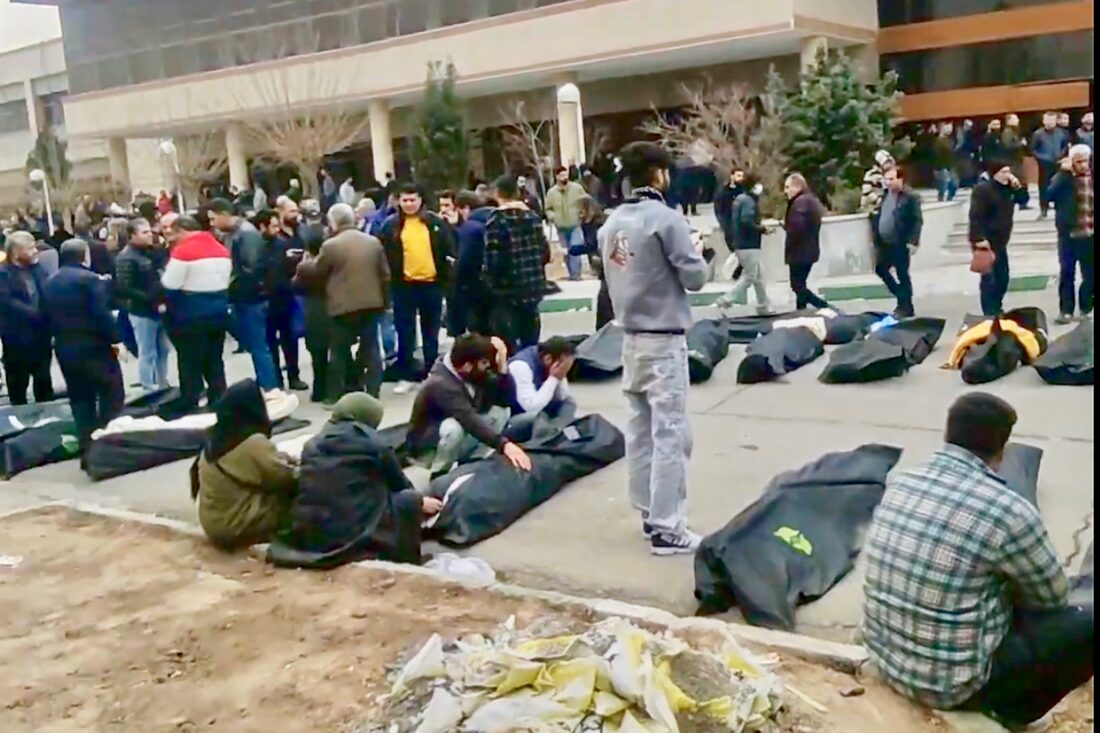 This frame grab from videos taken between Jan. 9 and Jan. 11, 2026, and circulating on social media purportedly shows images from a morgue with dozens of bodies and mourners after crackdown on the outskirts of Iran's capital, in Kahrizak, Tehran Province. (UGC via AP)