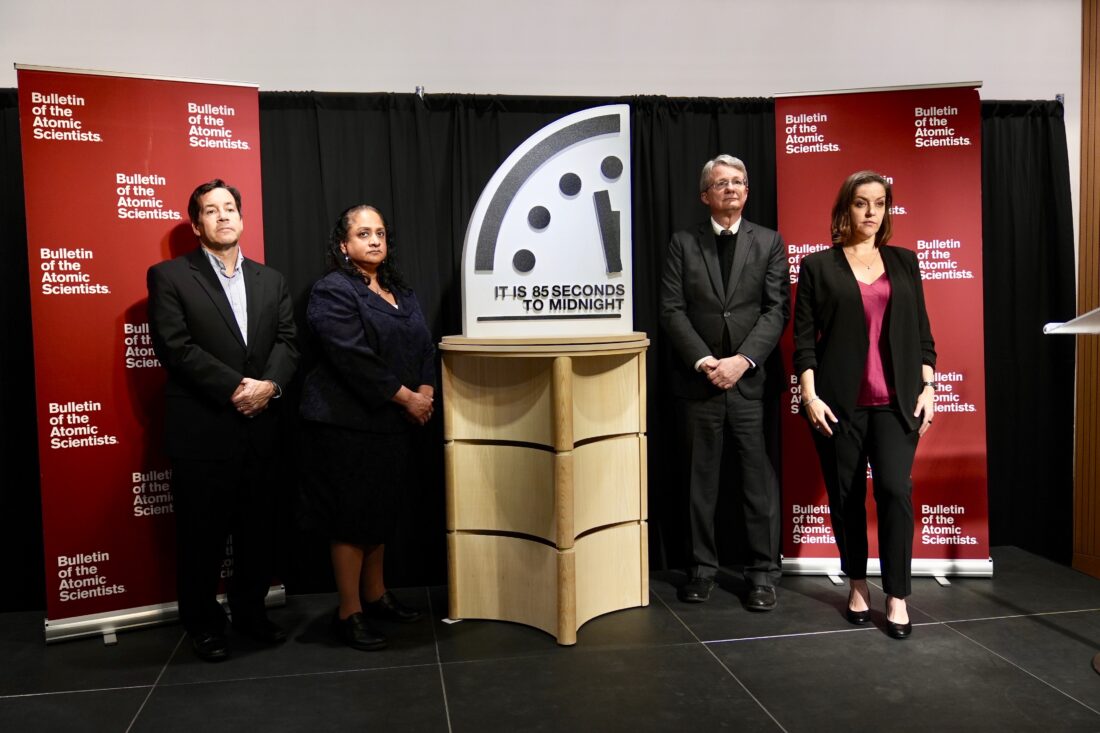 - The Bulletin of the Atomic Scientist members, from left, Jon B. Wolfsthal, Asha M. George, Steve Fetter and Alexandra Bell, reveal the Doomsday Clock, set to 85 seconds to midnight, during a news conference at the Carnegie Endowment for International Peace, Friday, Jan. 23, 2026, in Washington. (AP Photo/Pablo Martinez Monsivais)