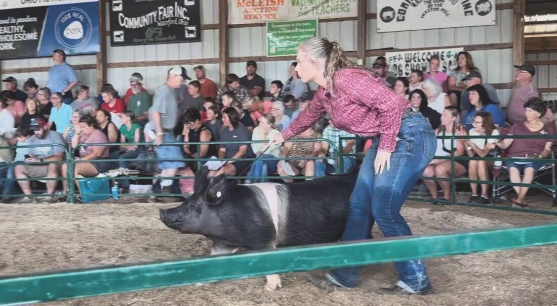 - Adie Mitchell showing her market hog at the Waterford Community Fair in August 2025. (Photo provided)