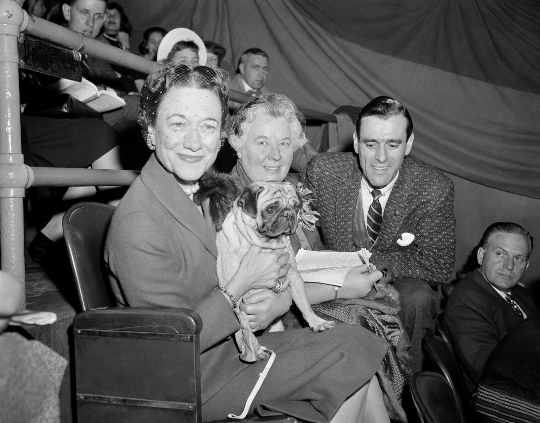 FILE - The Duchess of Windsor, Wallis Simpson, left, holds Ch. Pugville's Golden Victory during judging of the pug class during the Westminster Kennel Club Show at Madison Square Garden in New York, Feb. 13, 1956, as the dog's owner, Arnold Canton, far right, and dog breeder Harriet Smith, look on. (AP Photo/Jacob Harris, File)