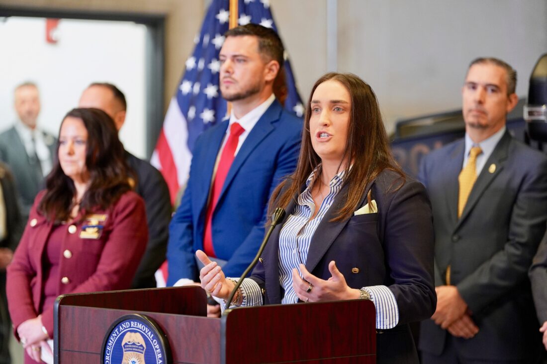 - FILE – Immigration and Customs Enforcement Deputy Director Madison Sheahan speaks during a news conference with Florida ICE and law enforcement officials at the South Florida U.S. Immigration and Customs Enforcement offices, Nov. 13, 2025, in Miramar, Fla. (AP Photo/Rebecca Blackwell, File)