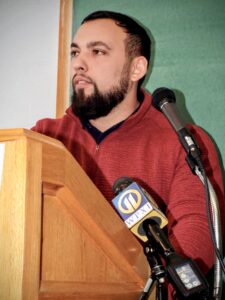 (Photo by Stephanie Ujhelyi) East Palestine Village Manager Antonio Diaz-Guy speaks during a ribbon cutting for the East Palestine Health Research Team office Tuesday in the Way Station.