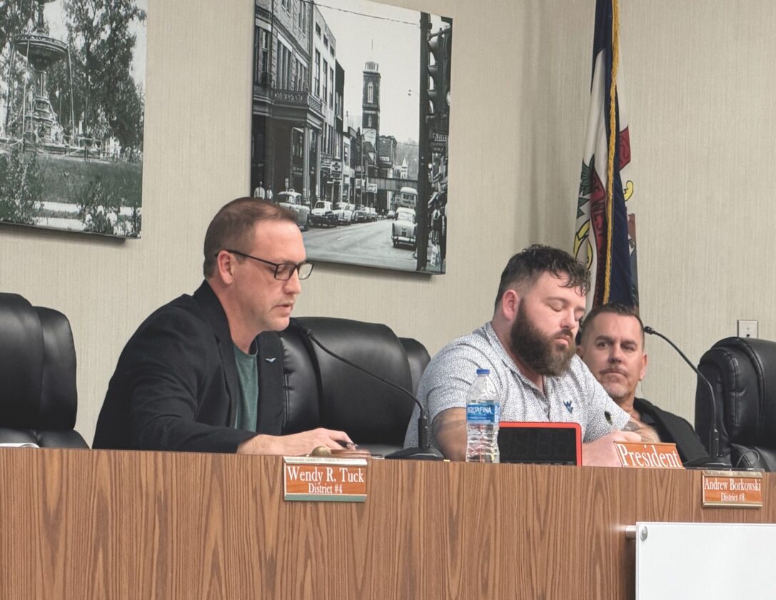 Parkersburg City Council President Andrew Borkowski, left, speaks during Tuesday’s council meeting as Councilmen Zak Huffman, center, and Mike Reynolds listen. Council voted 7-2 to approve the first reading of an ordinance authorizing a contract with Rumpke of Ohio for a subscription-based, curbside recycling program. (Photo by Amber Phipps)