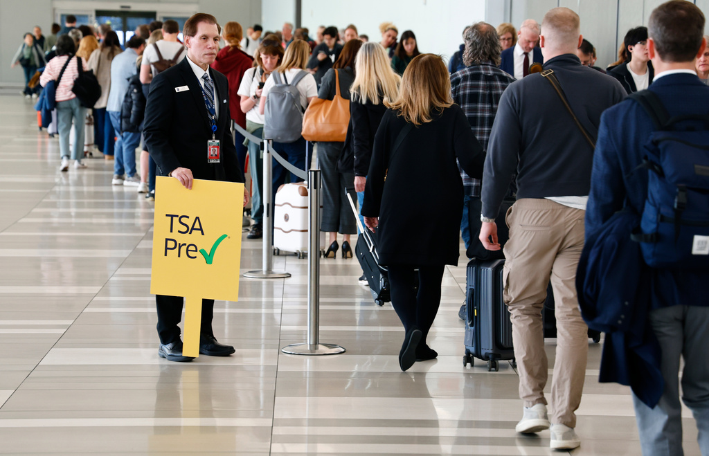 - Passengers stand in the TSA pre-check line at Laguardia Airport, Thursday, March 26, 2026, in New York. (AP Photo/Noah K. Murray)