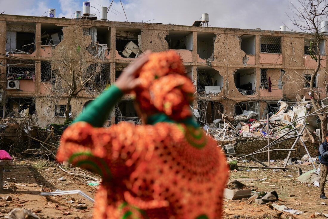 People survey a site that was struck by an Iranian missile in Dimona, southern Israel, Sunday, March 22, 2026. (AP Photo/Ariel Schalit)