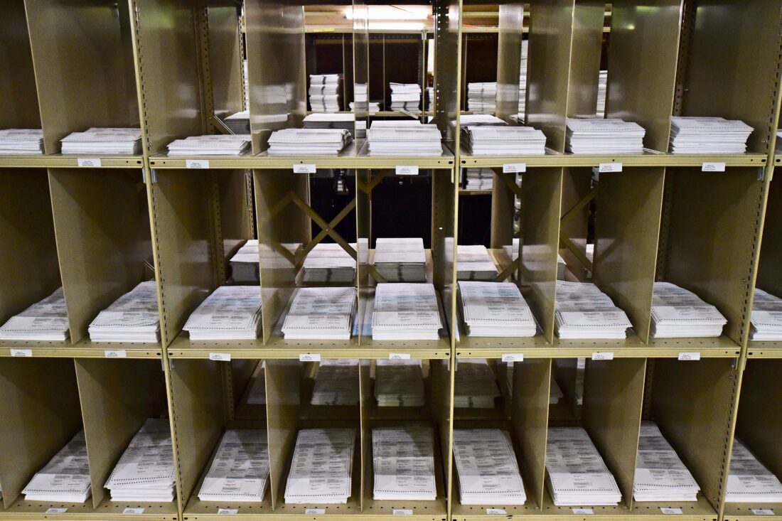 - FILE – Mail-in ballots sit on shelves inside the Trumbull County Board of Elections, Nov. 3, 2020, in Warren, Ohio. (AP Photo/David Dermer, File)