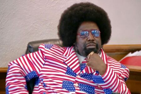 In court — wearing a red, white and blue American flag suit — he defended his work on First Amendment grounds and said he issued the diss tracks to cover damages from the raid, including a broken gate and front door.
