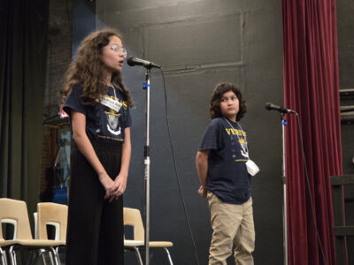 From left, Veritas Classical Academy fifth-grader Aadhya Adhikari competes with her brother, third-grader Aadhar Adhikari, for first place at The Marietta Times Regional Spelling Bee Friday at the Mid-Ohio Valley Players Theatre. (Photo by Gwen Sour)