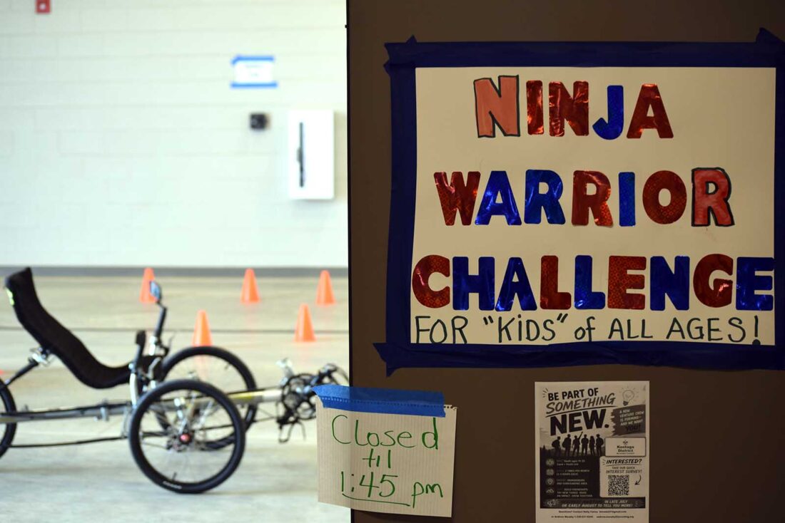 A ninja warrior challenge sign directs The Amputee Center Fun Fest attendees to an activity in the garage of the Wood County Resiliency Center on Saturday. (Photo by Amber Phipps)