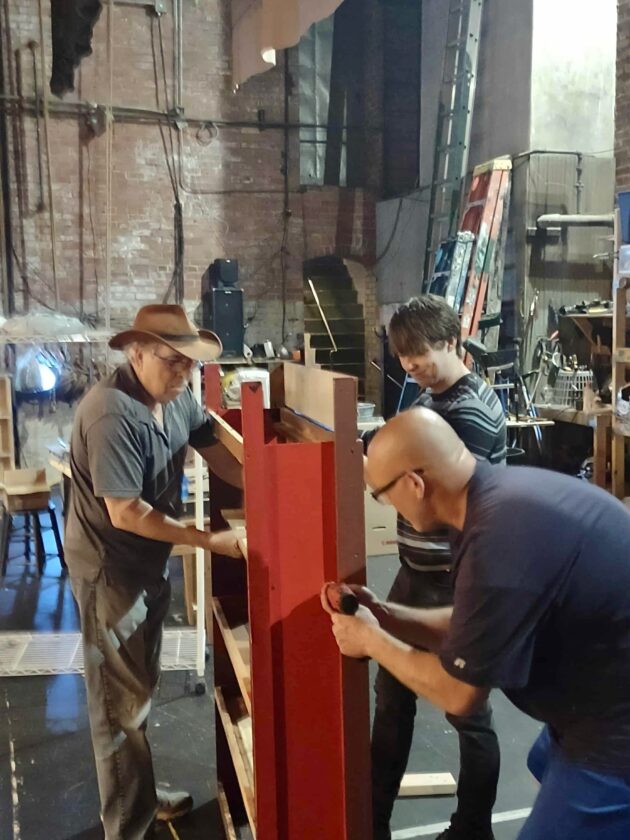 The cast of the Mid-Ohio Valley Players Theatre’s production “Shawshank Redemption” works on building set pieces in 2025. (Photo provided)