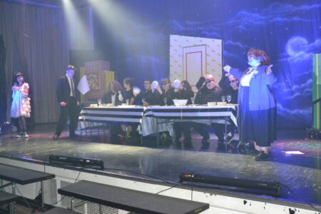 Lydia (Monica Bailey) looks on as her father Charles (Ty McFee), guests, lawyers and Delia (Sol Chancellor) start singing “Day-O” from the Belpre High School production of “Beetlejuice Jr.” that will be performed this Friday, Saturday and Sunday at the school. (Photo by Brett Dunlap)