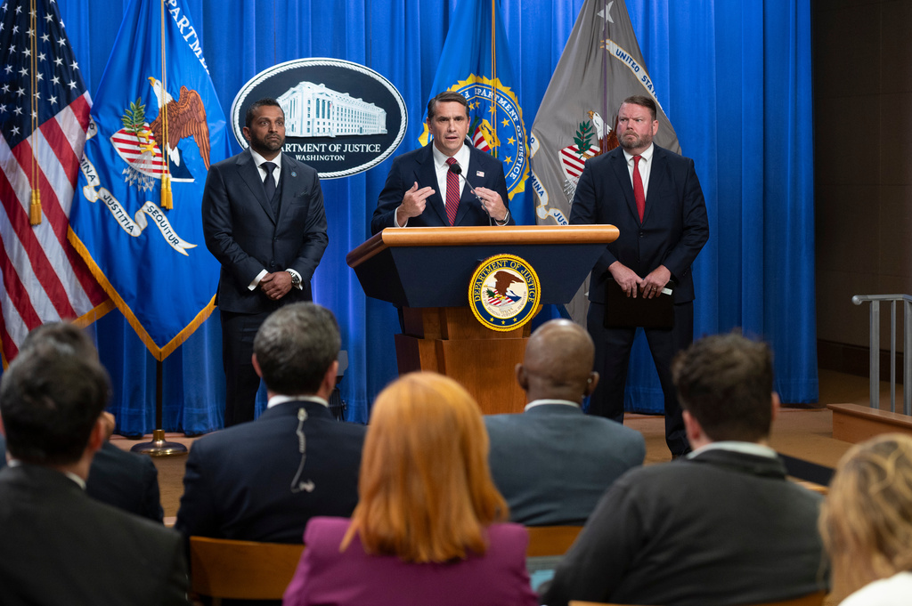 FBI Director Kash Patel, left, Acting Attorney General Todd Blanche, center, and Ellis Boyle, U.S. Attorney for the Eastern District of of N.C., announce that former FBI Director James Comey has been indicted, at the Justice Department in Washington, Tuesday, April 28, 2026. (AP Photo/Cliff Owen)