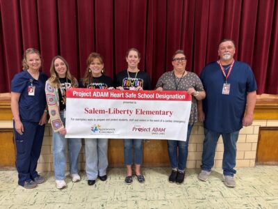 - From left, Lacey Wickham, Emily Klinger, Ericka Schneider, Kelly Henrix, Krista Ross and Matt Blair celebrate Salem-Liberty Elementary School’s designation as a Project ADAM Heart Safe School. (Photo provided)