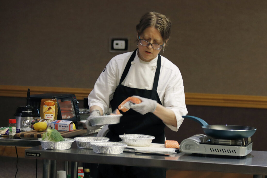 - Kim Burnett prepares salmon to be marinated during the GoPacks Top Chef Challenge fundraiser. (Photo by Gwen Sour)