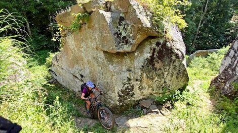 A lone bicyclist pedals past a boulder on the Boot Bridge Trail at Mountwood Park in August. (Photo provided by Ryan Smith)