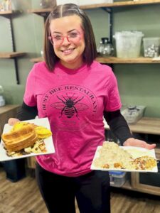 Busy Bee co-owner Stephanie Cowart poses with two plates of breakfast orders on a busy morning in February. (Photo provided by Stephanie Cowart)