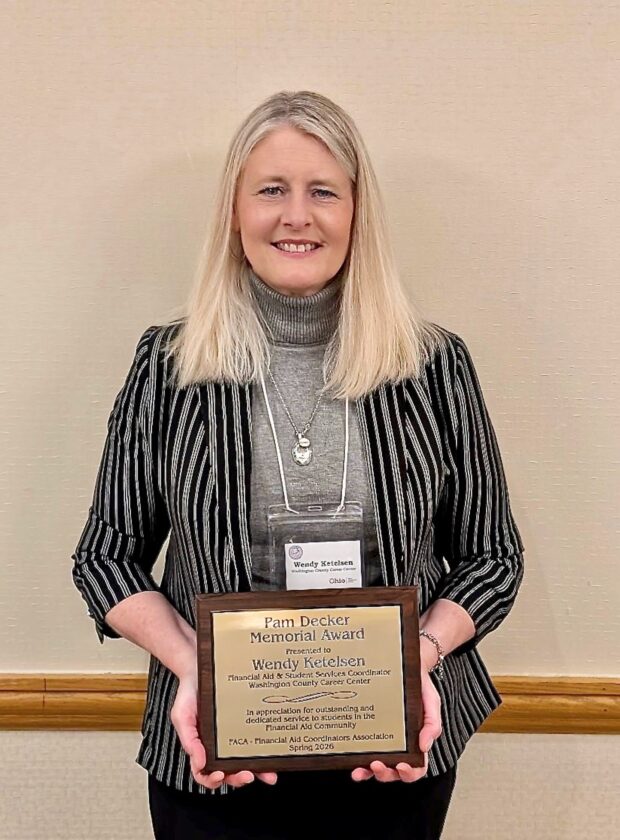 Washington County Career Center – Adult Technical Training announced that Wendy Ketelsen has been recognized with the Pam Decker Outstanding Service Award, a statewide honor presented annually to an outstanding financial aid administrator serving Ohio Technical Centers and Adult Career Centers.