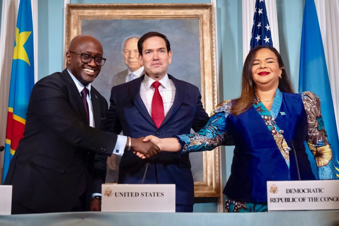 - Secretary of State Marco Rubio, center, stands with Rwanda’s Foreign Minister Olivier Nduhungirehe, left, and Democratic Republic of the Congo’s Foreign Minister Therese Kayikwamba Wagner, right, as they shake hands after signing a peace agreement at the State Department, Friday, June 27, 2025, in Washington. (AP Photo/Mark Schiefelbein).