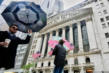 - People with umbrellas pass the New York Stock Exchange, Monday, Oct. 13, 2025. (AP Photo/Richard Drew)
