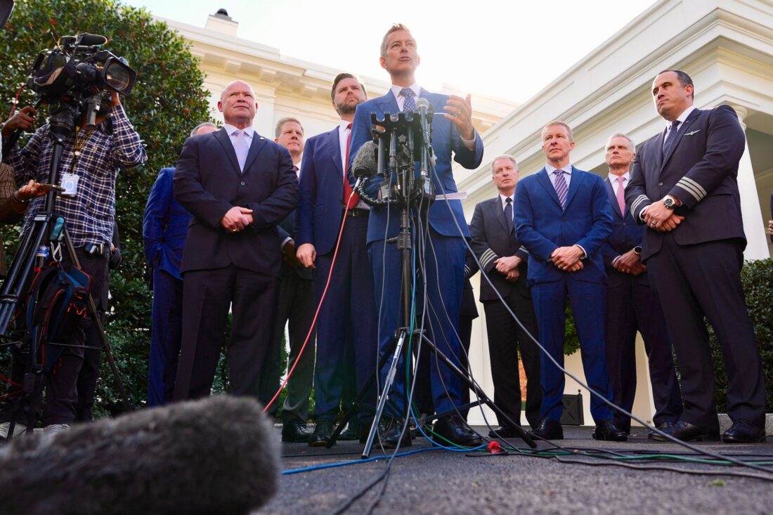 Transportation Secretary Sean Duffy speaks to the media alongside Sean O'Brien, President of the International Brotherhood of Teamsters, from left, Chris Sununu, president & CEO of Airlines for America, Vice President JD Vance and aviation industry representatives, about the impact of the government shutdown on the aviation industry, outside of the West Wing of the White House, Thursday, Oct. 30, 2025, in Washington. (AP Photo/Jacquelyn Martin)