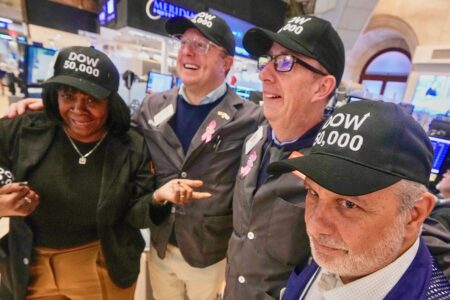- Trader Joel Lucchese, right, and colleagues wear “DOW 50,000” caps on the floor of the New York Stock Exchange as the Dow Jones industrial average intra-day number topped the 50,000 level for the first time, Friday, Feb. 6, 2026. (AP Photo/Richard Drew)