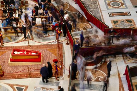 - People line up to pay their respects to Pope Francis lying in state, inside St. Peter’s Basilica, at the Vatican, Friday, April 25, 2025. (AP Photo/Andrew Medichini)