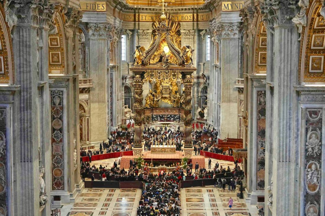People line up to pay their respects to Pope Francis lying in state, inside St. Peter's Basilica, at the Vatican, Friday, April 25, 2025. (AP Photo/Andrew Medichini)