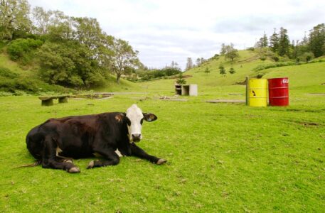 - FILE – A cow rests near a park bench and trash bins on August 12, 2002 on Australia’s remote Norfolk Island. (AP Photo/Rick Rycroft, File)