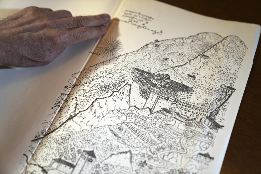 Father Makarios shows a 1744 map depicting the Simonopetra, or the Simonos Petra Monastery, home of the all-male autonomous community Agion Oros, or Holy Mountain, on the peninsula of Mount Athos in northern Greece, Monday, April 14, 2025. (AP Photo/Thanassis Stavrakis)