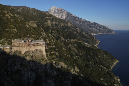MOUNT ATHOS, Greece (AP) — The medieval monastery clings almost impossibly to sheer cliffs high above the shimmering turquoise of the Aegean Sea. Rising from the rugged granite rock, its walls enclose a diverse Christian Orthodox community.