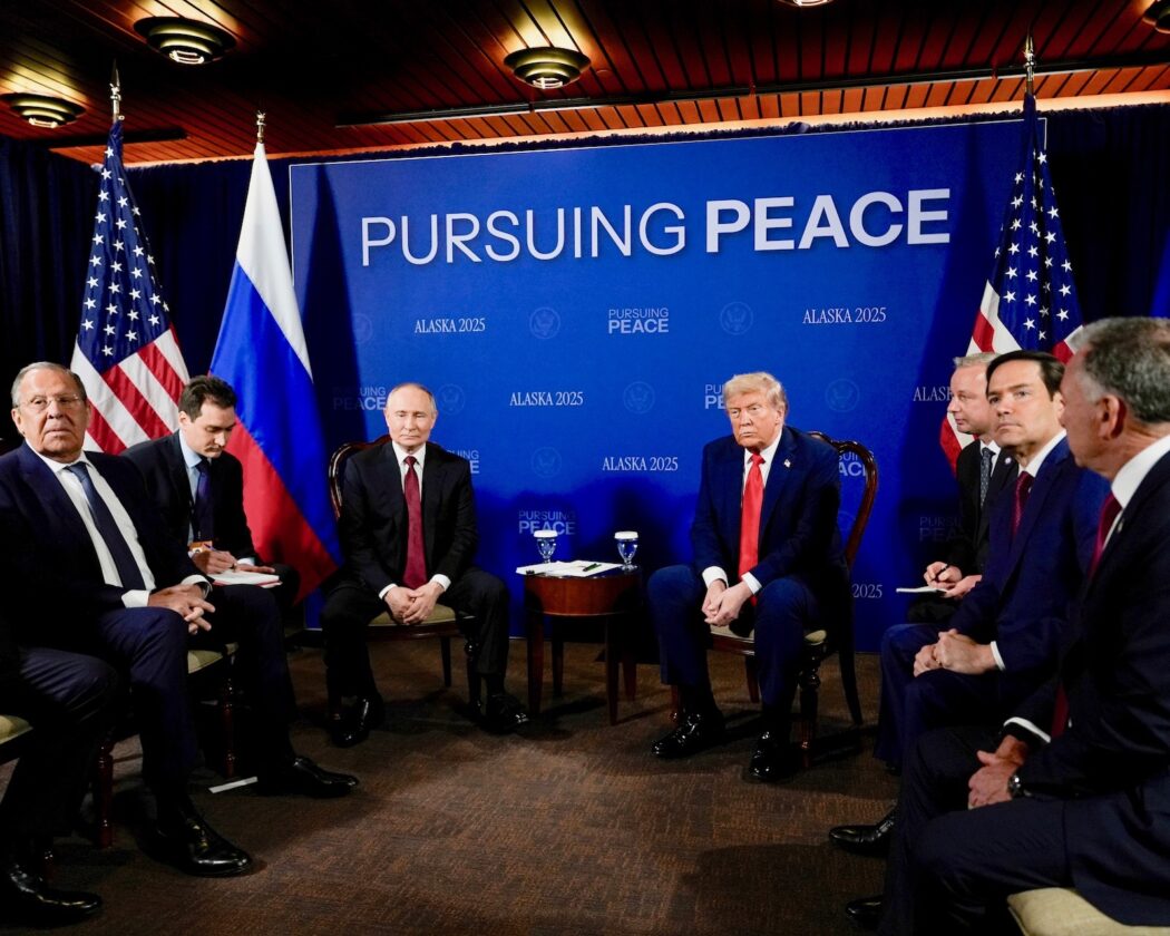 - President Donald Trump meets with Russia’s President Vladimir Putin Friday, Aug. 15, 2025, at Joint Base Elmendorf-Richardson, Alaska. At left is Russia’s Foreign Minister Sergey Lavrov and second from right is Secretary of State Marco Rubio. (AP Photo/Julia Demaree Nikhinson)