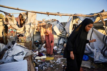 At dawn, displaced Palestinians at the camp cleared remains of a destroyed tent next to a crater where the strike hit. They found the body of a small child and wrapped it in a blanket.
