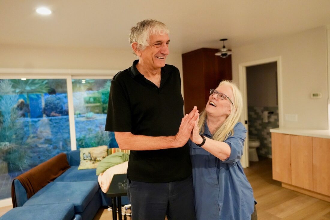 John Martinis stands with his wife Jean in their living room after winning the Nobel Prize in Physics for his work on quantum tunneling on Tuesday, Oct. 7, 2025, in Santa Barbara, Calif. (AP Photo/Mark J. Terrill)