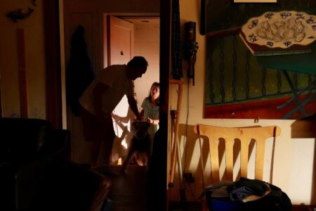 - John Martinis stands with his wife Jean in their living room after winning the Nobel Prize in Physics for his work on quantum tunneling on Tuesday, Oct. 7, 2025, in Santa Barbara, Calif. (AP Photo/Mark J. Terrill)