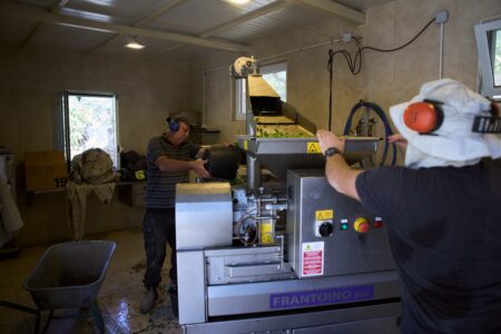 Once they filled a wheelbarrow, Dalla Gassa put on ear covers and got the loud, modern press humming. Soon, the fragrance of freshly pressed green oil filled the air. It takes up to 10 kilograms (22 pounds) of olives to make one liter (34 ounces) of extra-virgin oil.