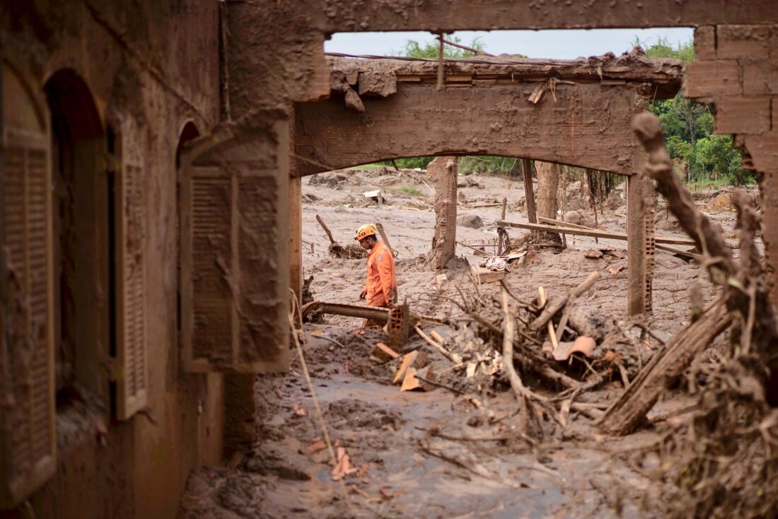 - FILE – A rescue worker walks between destroyed houses after a dam burst in the town of Bento Rodrigues, Minas Gerais state, Brazil, Nov. 8, 2015. (AP Photo/Felipe Dana, File)