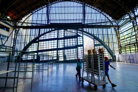 Electoral workers prepare the old Mapocho train station, now a cultural center, to be used as a polling station for the general election in Santiago, Chile, Friday, Nov. 14, 2025. (AP Photo/Esteban Felix)