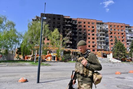 - FILE – A Ukrainian soldier walks past damaged buildings in central Pokrovsk, in the Donetsk region of Ukraine, April 23, 2025. (AP Photo/Michael Shtekel, File)