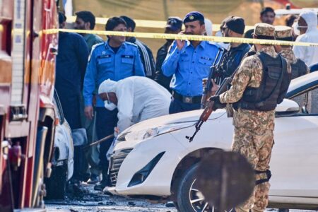 - Pakistani investigators examine a damaged car at the site of a suicide bombing outside the gates of a district court, in Islamabad, Pakistan, Tuesday, Nov. 11, 2025. (AP Photo/Ahsan Shahzad)